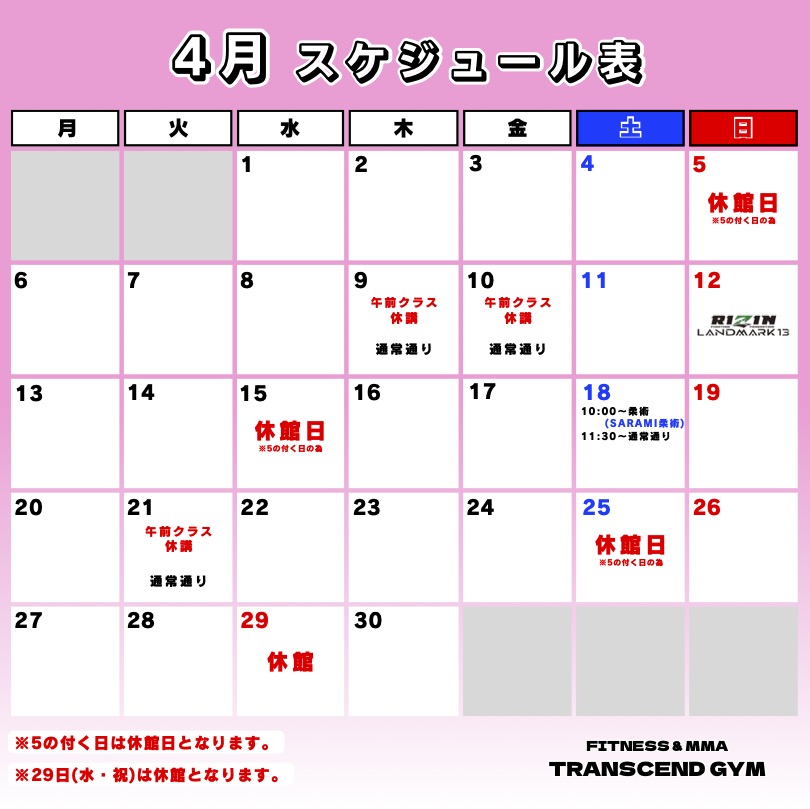 *4月の予定表* 3月 28, 2026 最終更新日時 : 3月 28, 2026 teamtranscend ご不明な点やお問い合わせはお気軽にこちらまで(^ ^)☎︎ 09065646796 (受付時間…平日21:00迄/土日営業時間内迄)